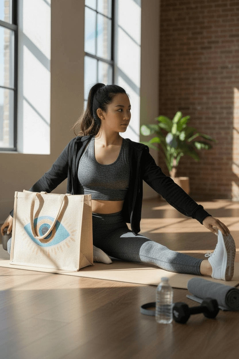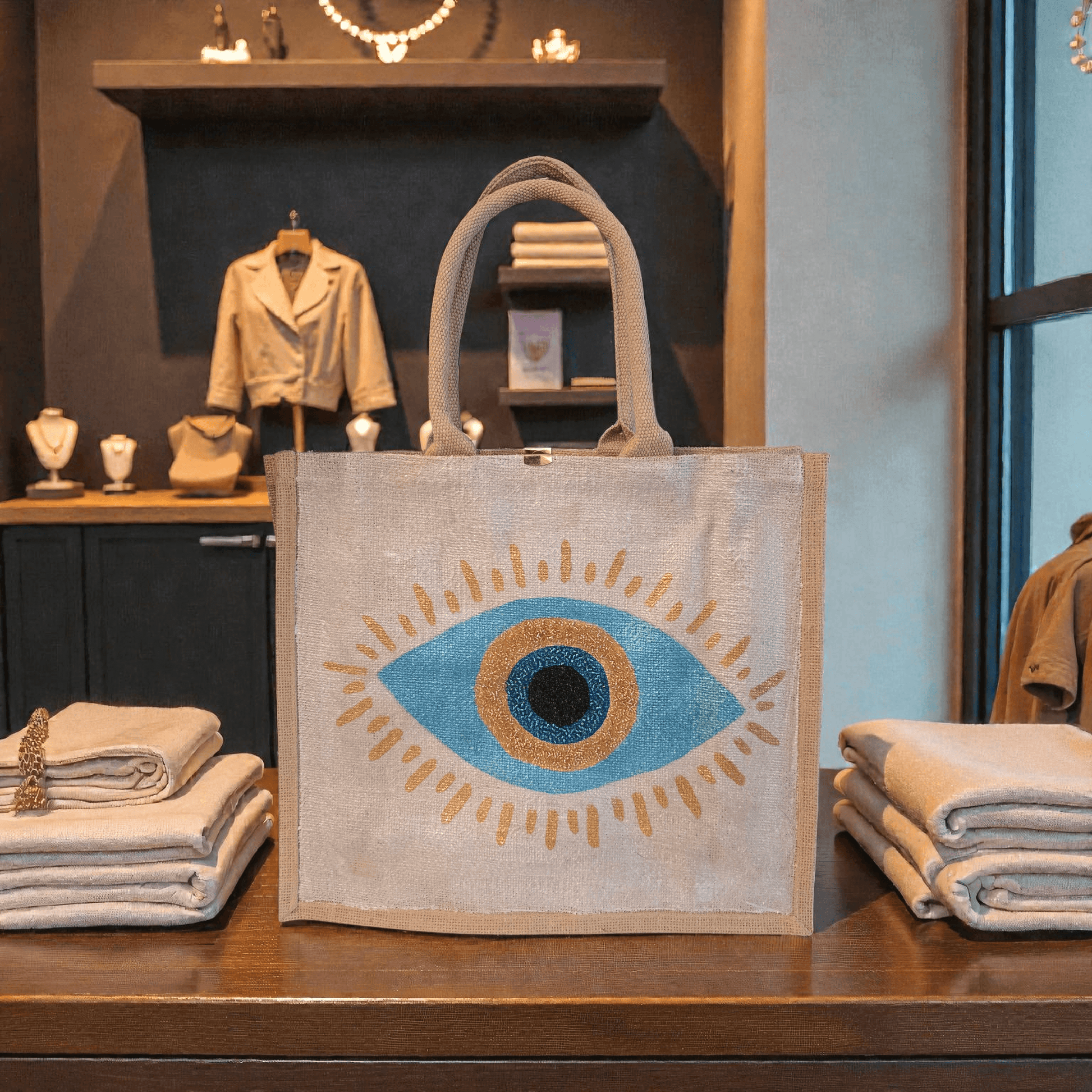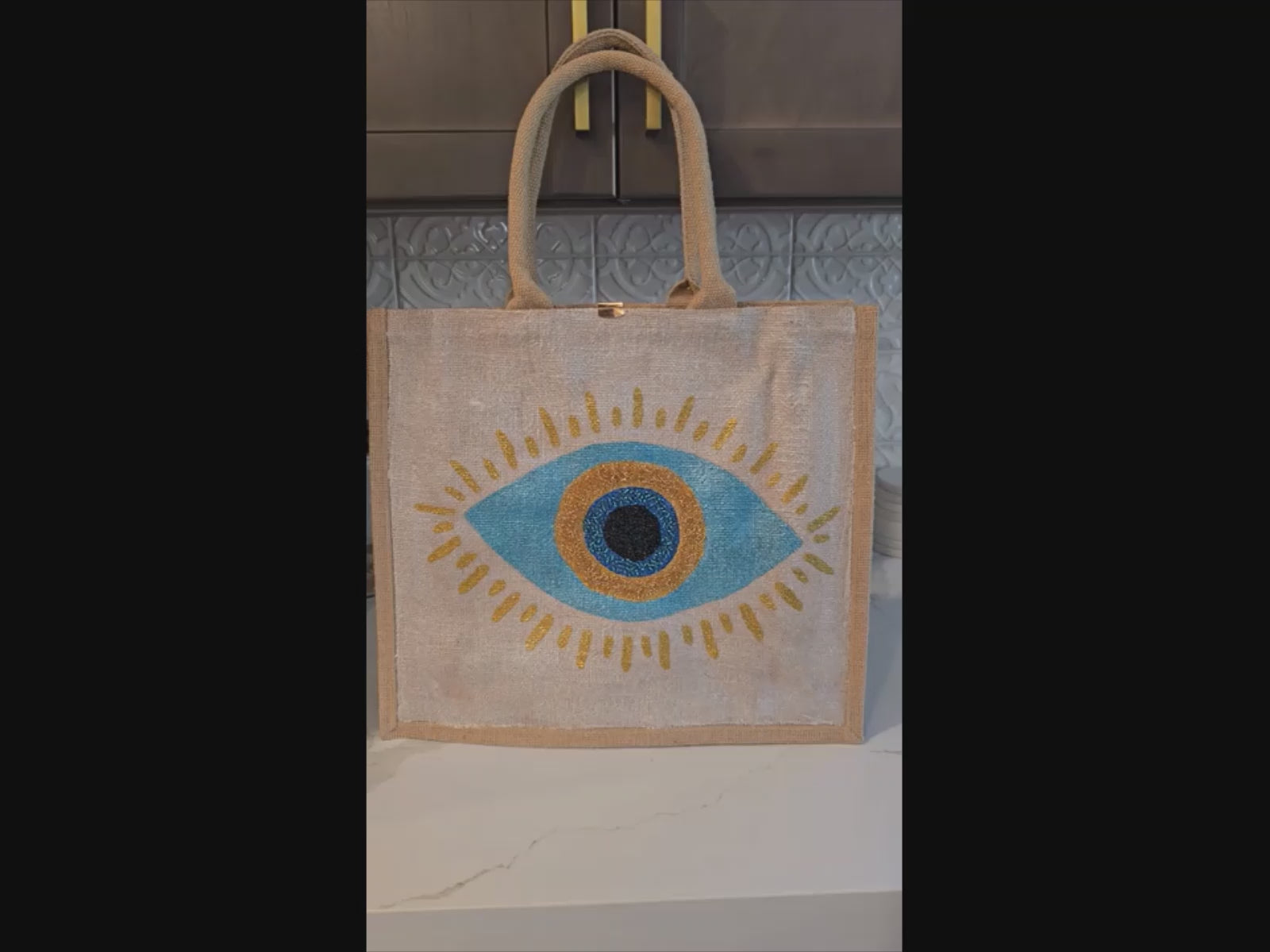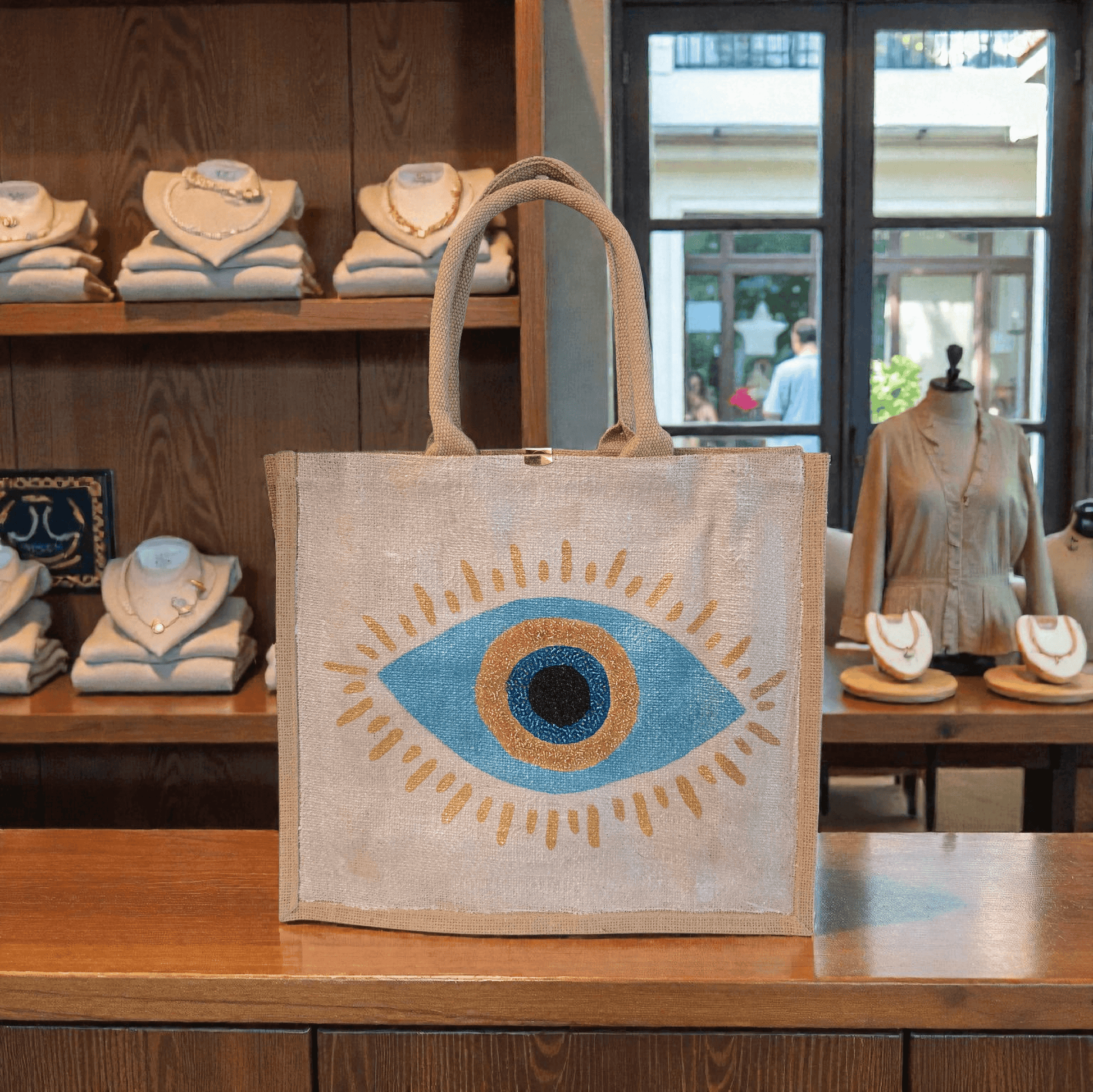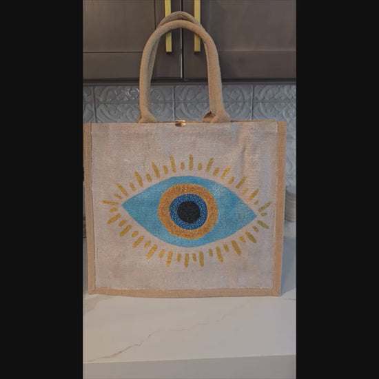 Rooted in symbolism and painted with intention, this Evil Eye Purse Tote blends timeless meaning with modern style. The iconic evil eye motif—long believed to offer protection and positive energy—is hand-painted in soothing blue tones with warm gold accents on a natural jute tote.